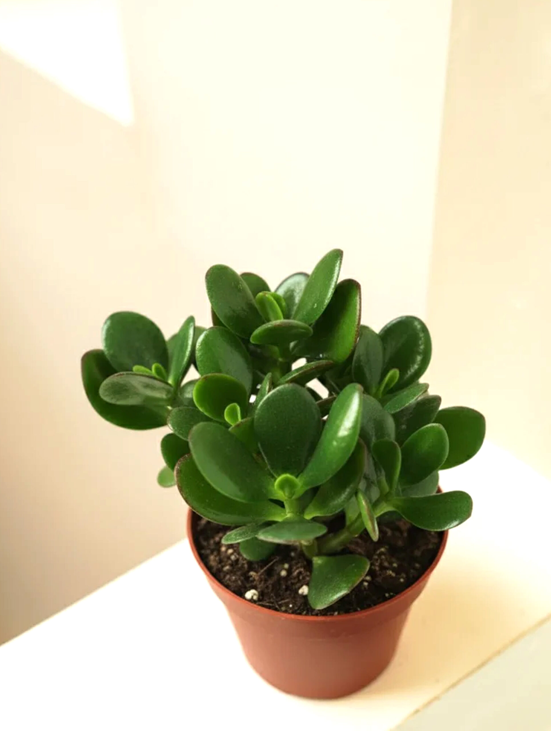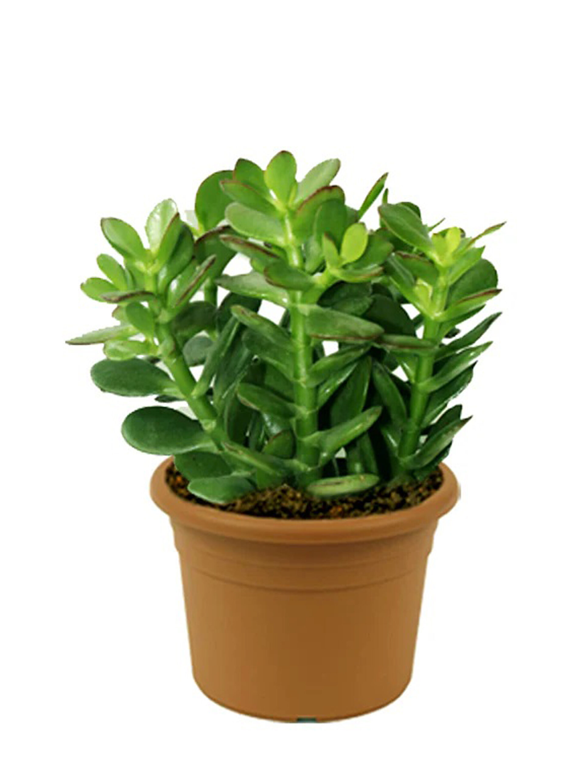 The Jade Plant, also known as Crassula Ovata, is a popular succulent native to South Africa. It is a small, slow-growing plant that can reach up to 20cm in height and 30cm in width. The plant has thick, fleshy leaves that are oval-shaped and glossy, with a dark green color that can sometimes have a reddish tint. The leaves are arranged in pairs along the stem, and they can grow up to 5cm long.