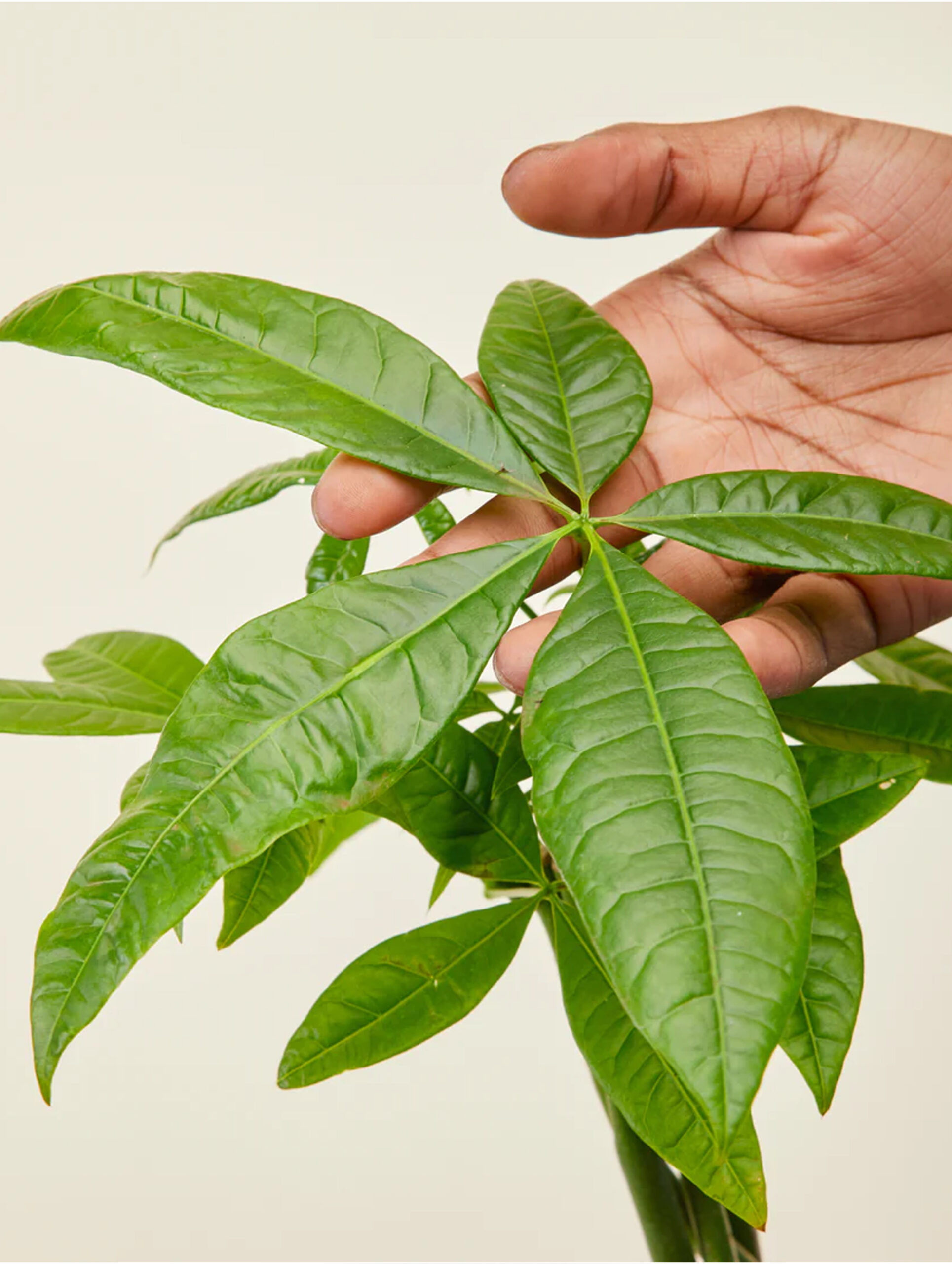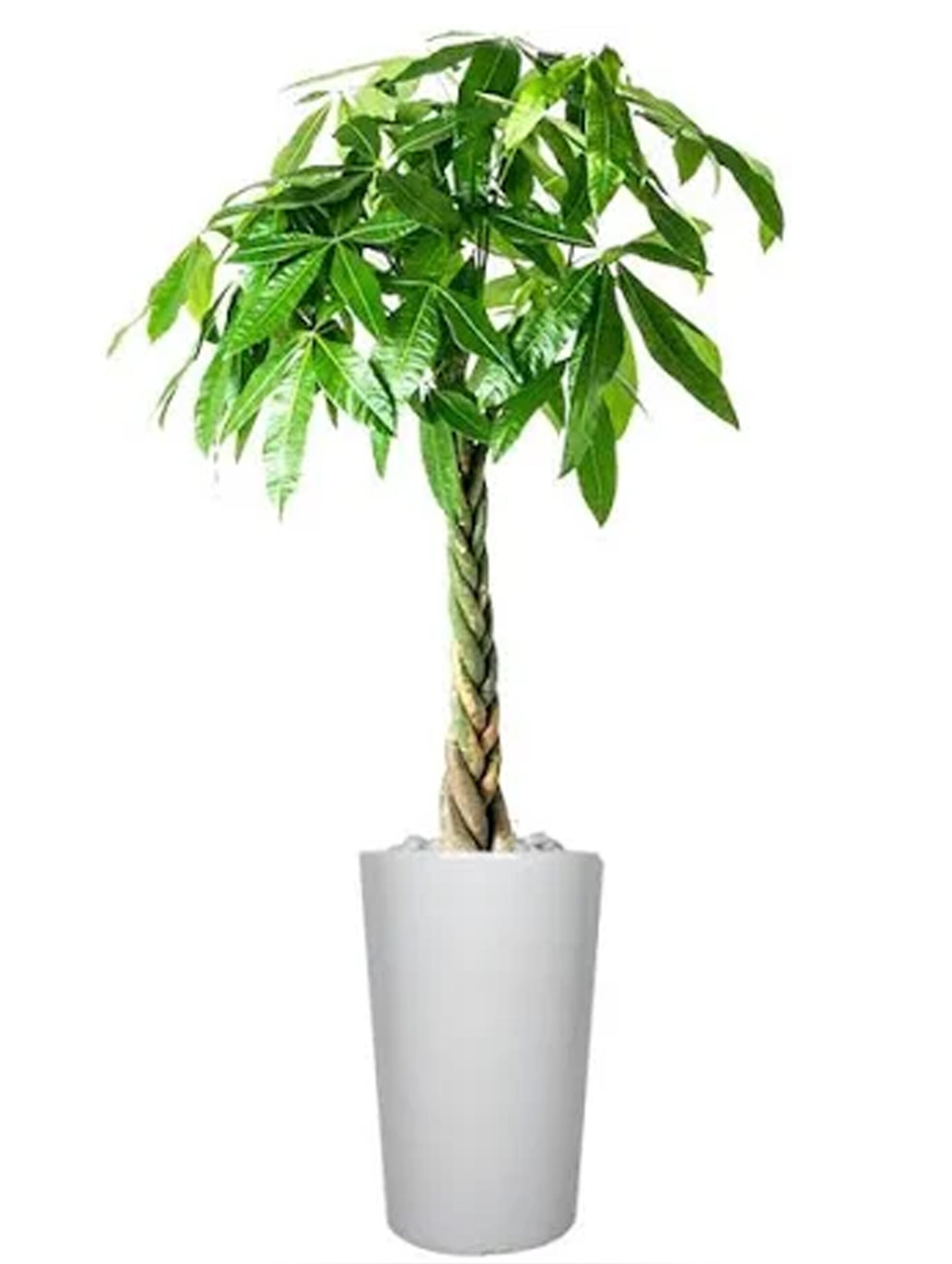 The Pachira Aquatica is a bushy green plant with braided that typically grows to a height of 120 cm. It features a thick, sturdy stem that supports a cluster of glossy, dark green leaves, which are oval-shaped and have a slightly wavy edge. Additionally, the plant is known for its ability to produce small, white flowers that bloom sporadically throughout the year. One of the most interesting features of the Pachira is its braided trunk, which adds to the plant’s aesthetic appeal and makes it more resilient and durable.